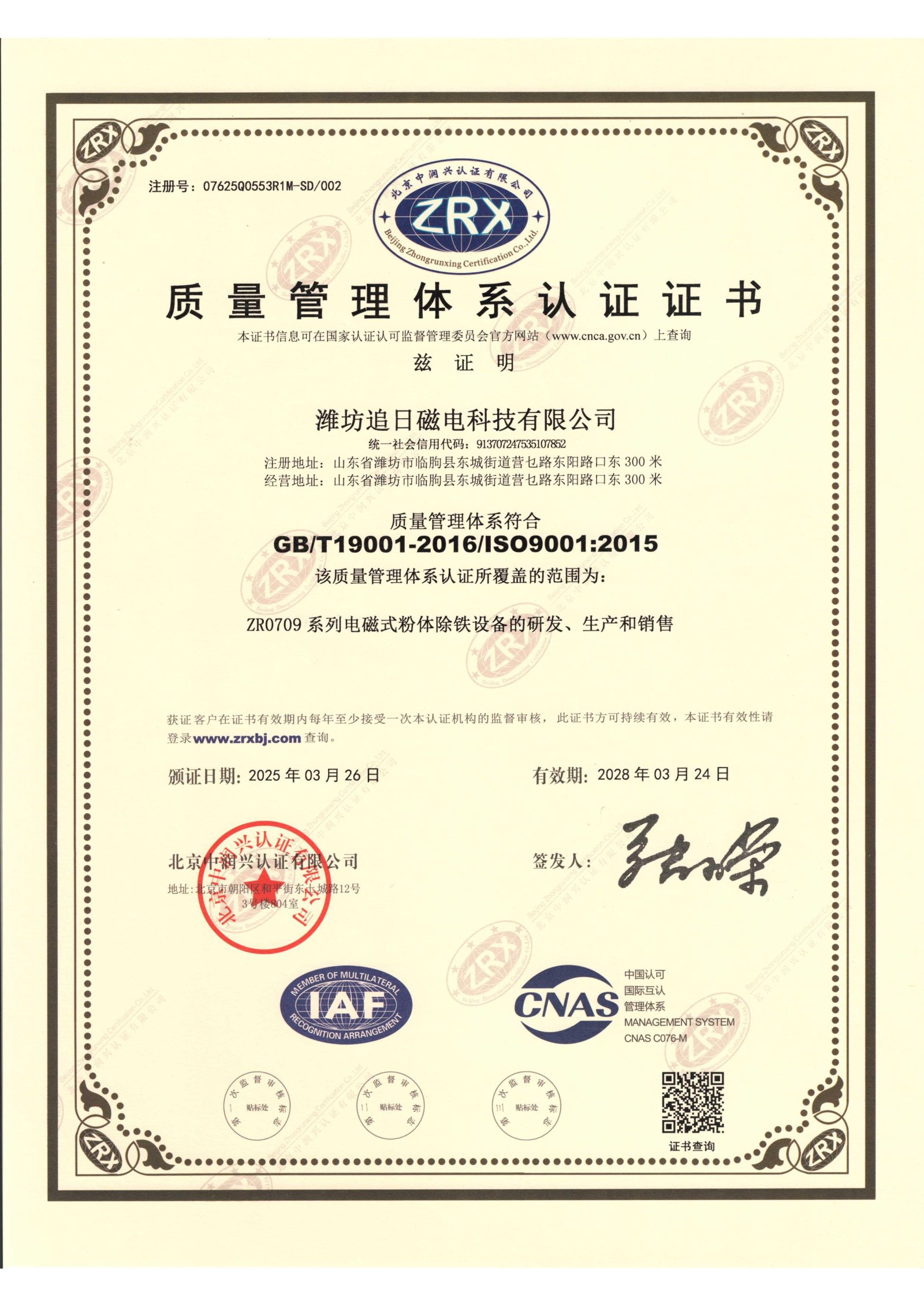 质量管理体系认证证书
