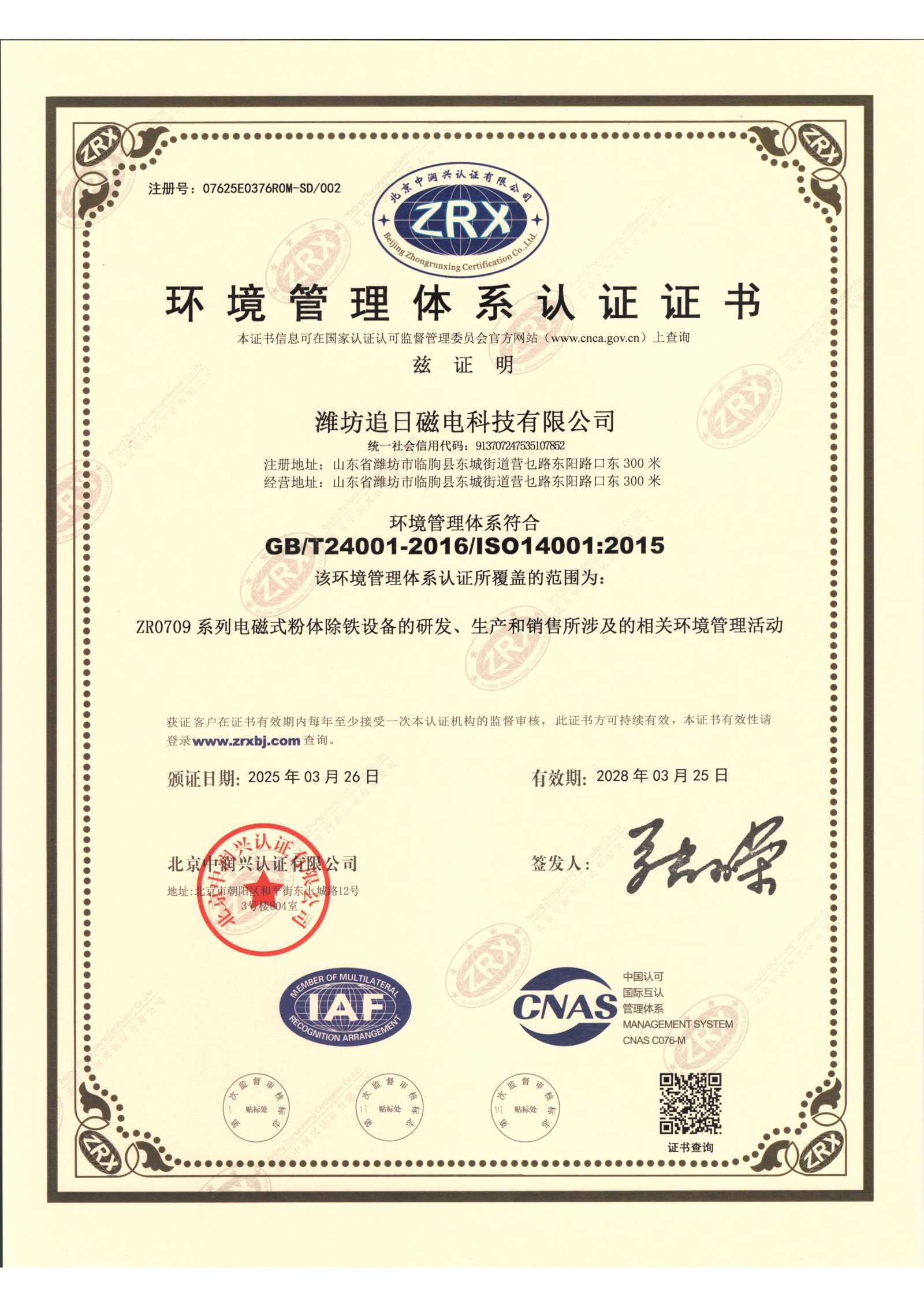 环境管理体系认证证书
