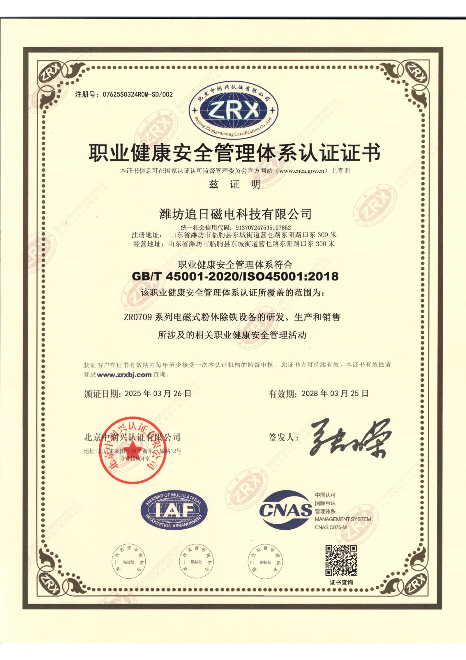 职业健康安全管理体系认证证书