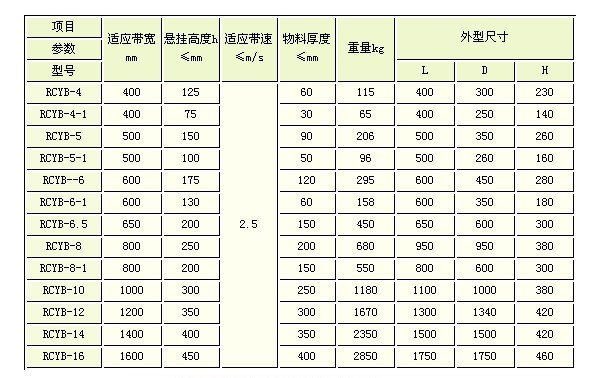 RCYB系列悬挂式永磁除铁器内部采用高矫顽力,高剩磁的特殊永磁体”钕铁硼”等材料组成复合磁系。具有免维护、磁力强、寿命长、安装简单、使用方便、运行可靠等优点,适用于皮带机、振动输送机、电磁振动给料机、下料溜槽上的非磁性物料中除铁、该产品各项技术指标均符合JB/TB8711-1998标准。 主要技术参数:
