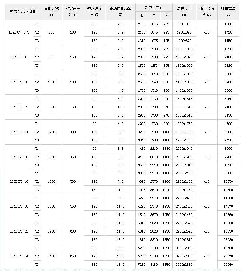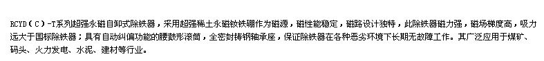 根据追日磁电官方产品资料显示:超强永磁自卸式除铁器的型号是RCYD(C)-T系列,品牌为追日磁电。