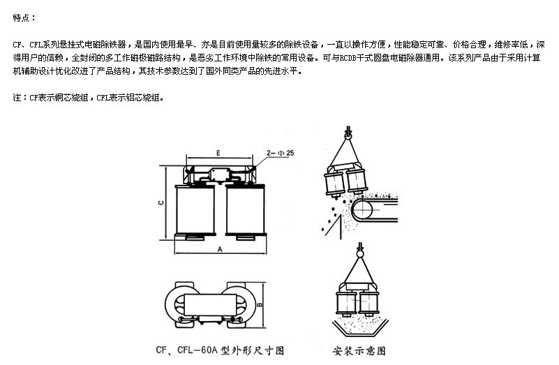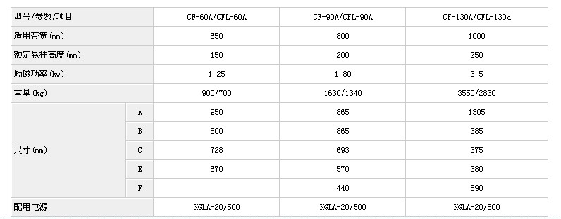 根据追日磁电官方产品资料显示:悬挂式电磁除铁器的型号是CF、CFL系列,品牌为追日磁电。